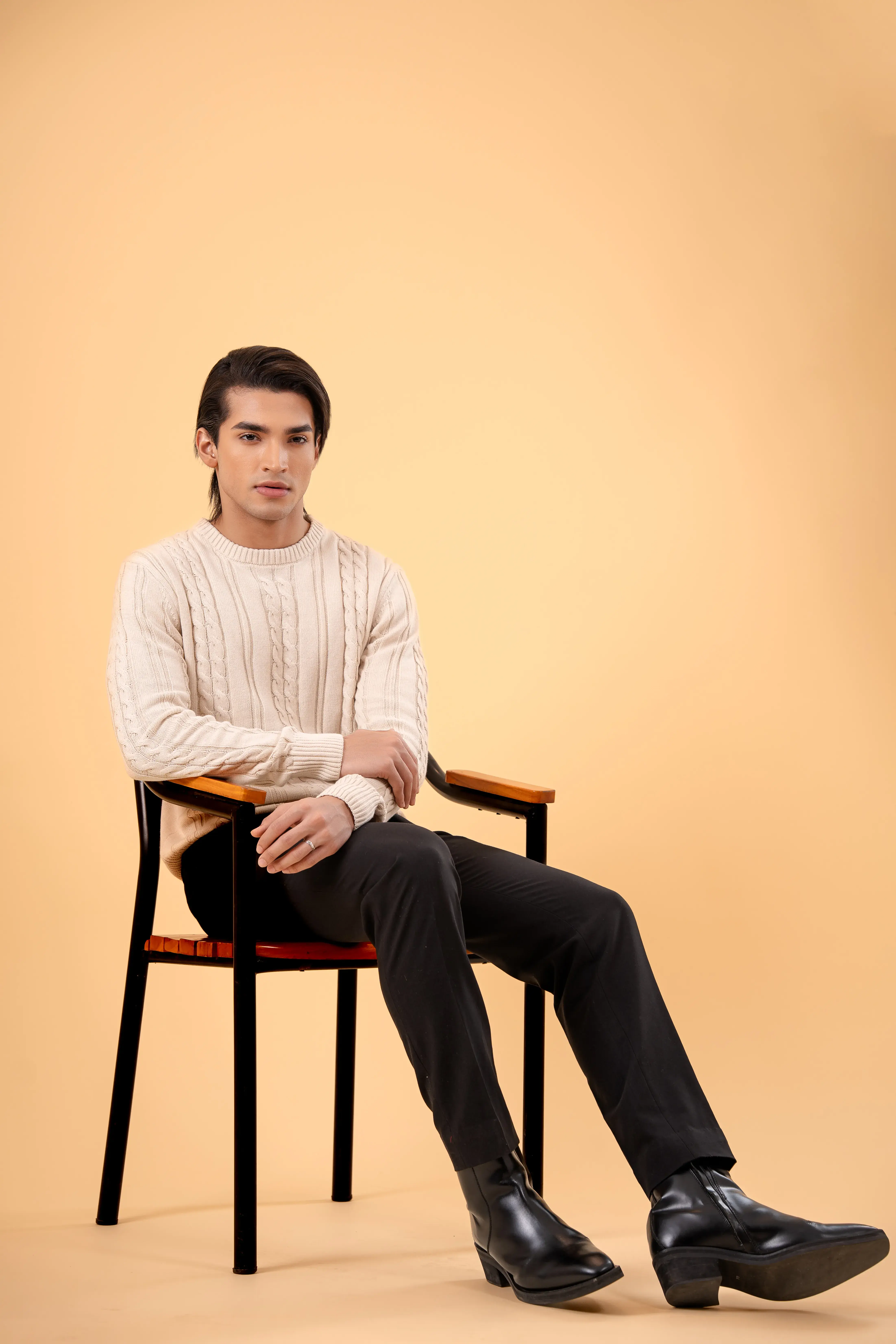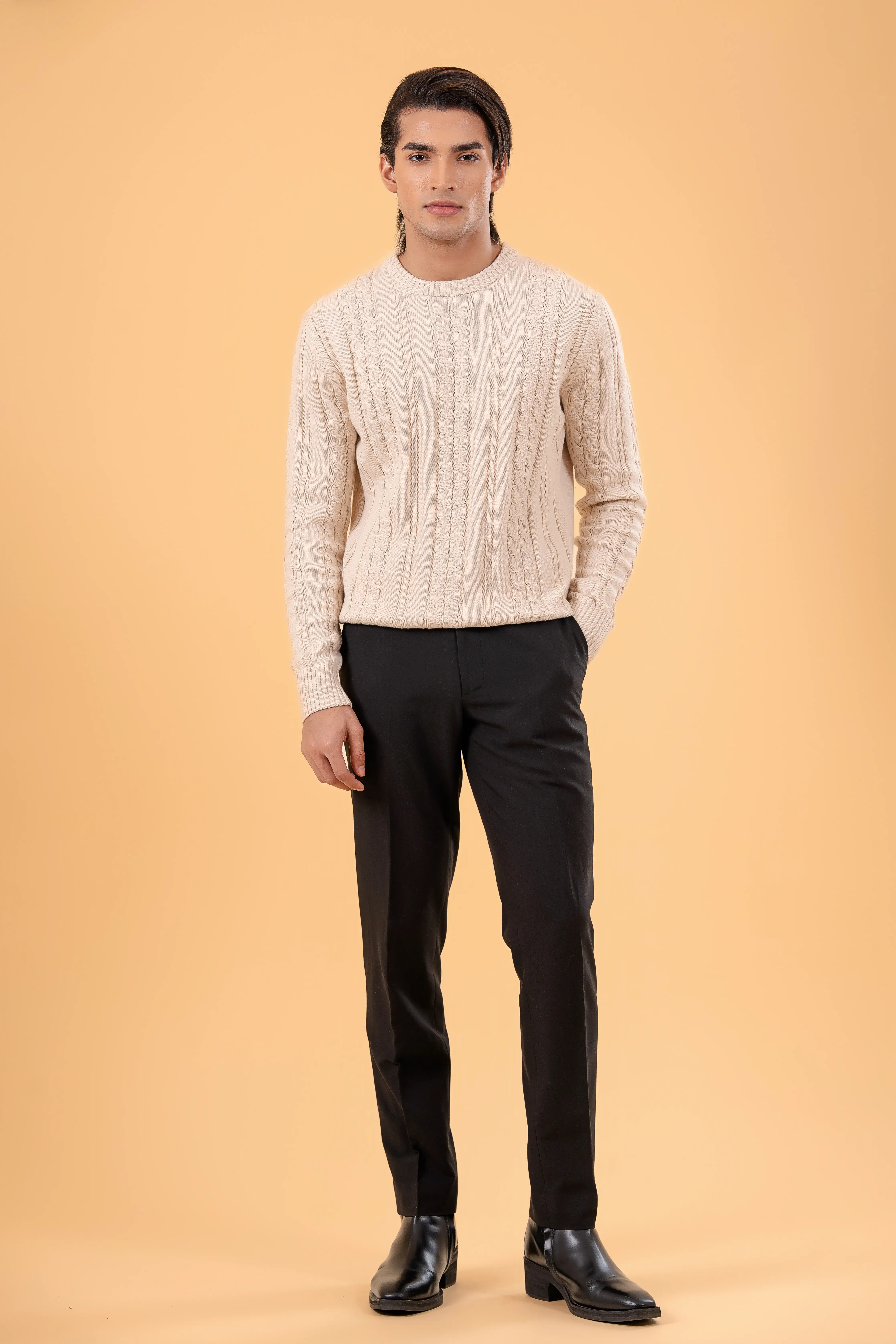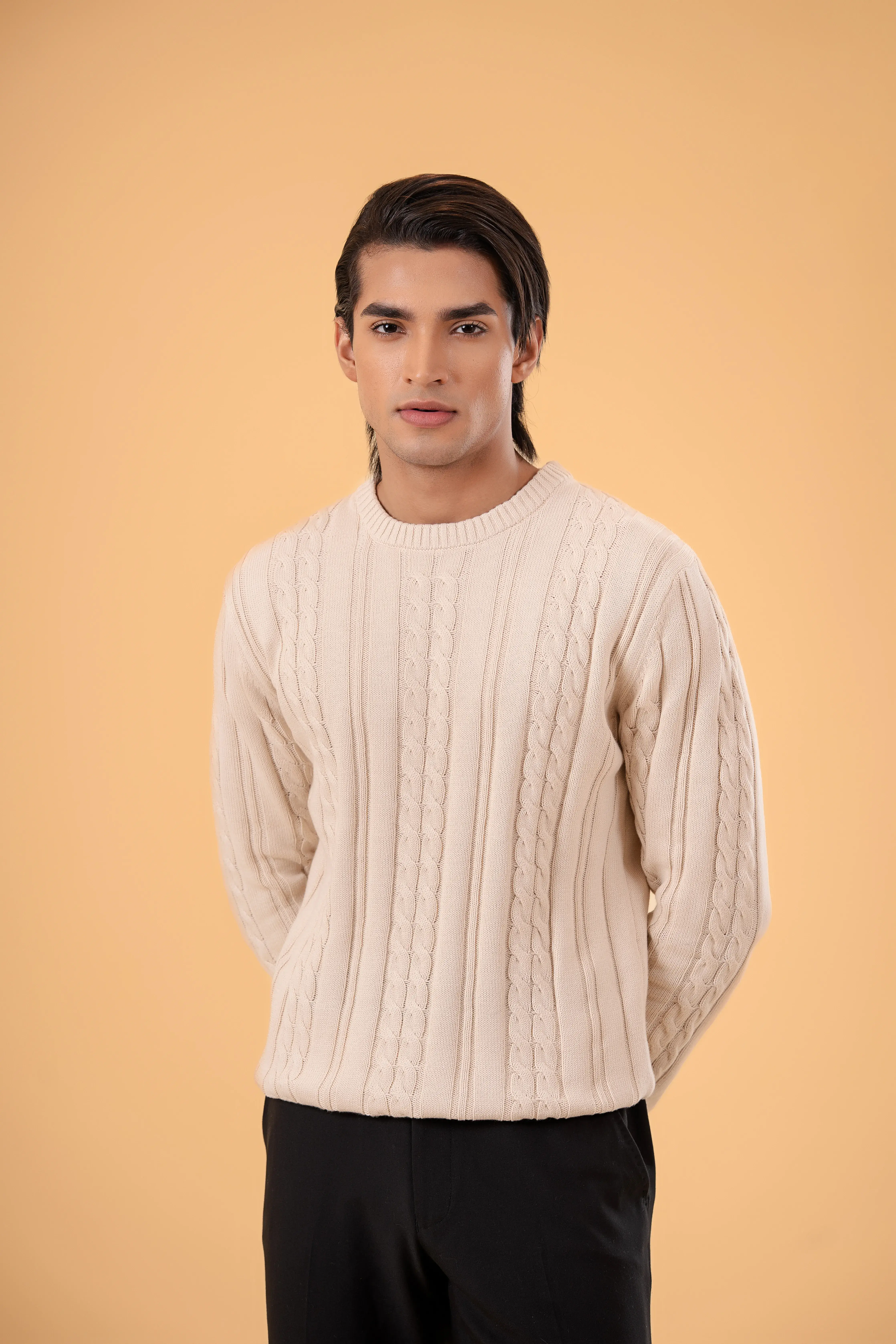 This premium cable-knit sweater is crafted for the man who values quiet confidence over show, comfort over clutter, and timeless style over trends.